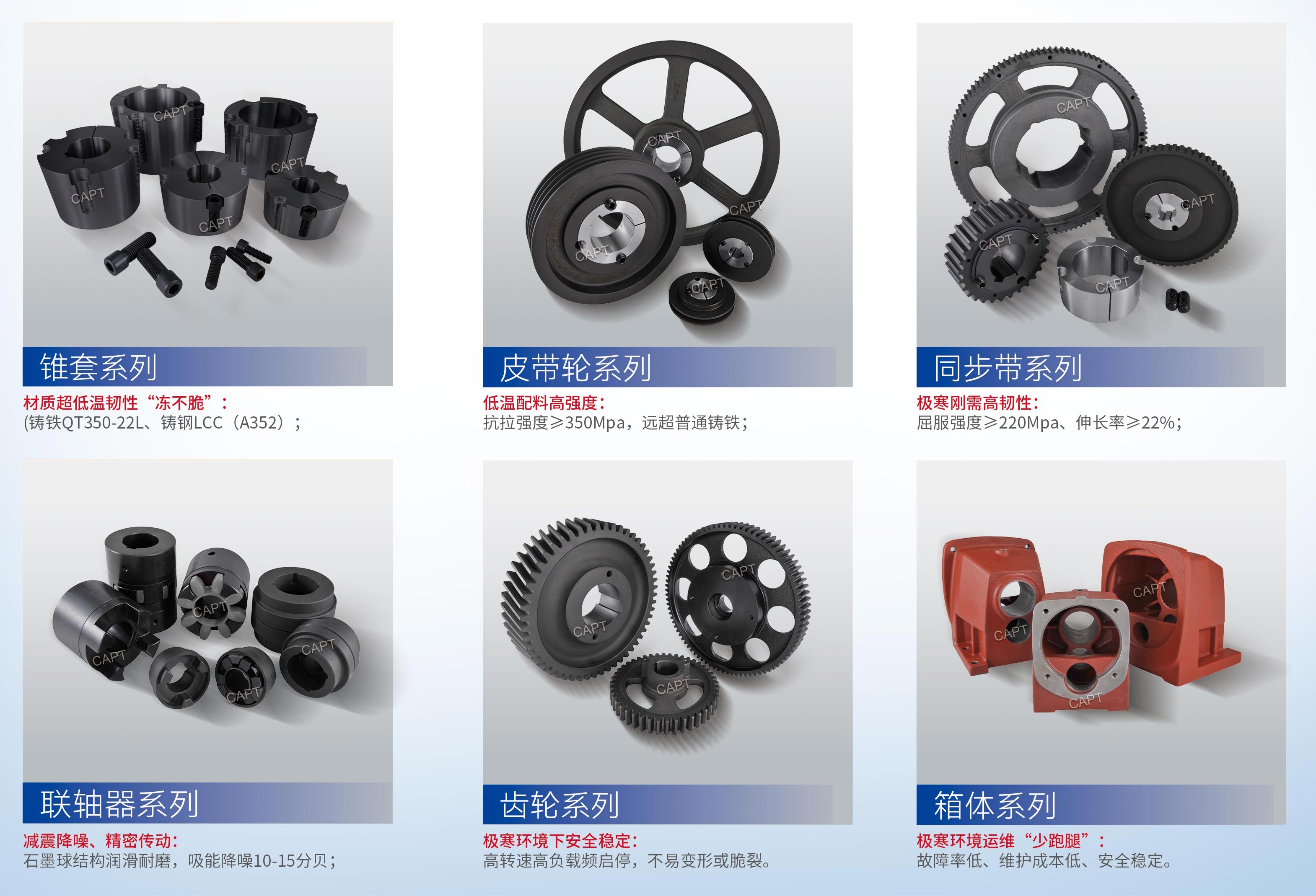 在高緯度冰封荒原、高海拔雪域等極端環(huán)境中,-30℃甚至 - 40℃的低溫如同 “隱形殺手”—— 普通機(jī)械傳動零件易因低溫脆性斷裂、尺寸變形、頻繁故障陷入癱瘓,不僅影響設(shè)備運(yùn)行,更推高運(yùn)維成本。而超低溫球墨鑄鐵或者鑄鋼傳動件(涵蓋皮帶輪、同步帶輪、鏈輪、齒輪、聯(lián)軸器、聯(lián)接錐套、箱體等全品類),正是為破解極寒挑戰(zhàn)而生的可靠之選。